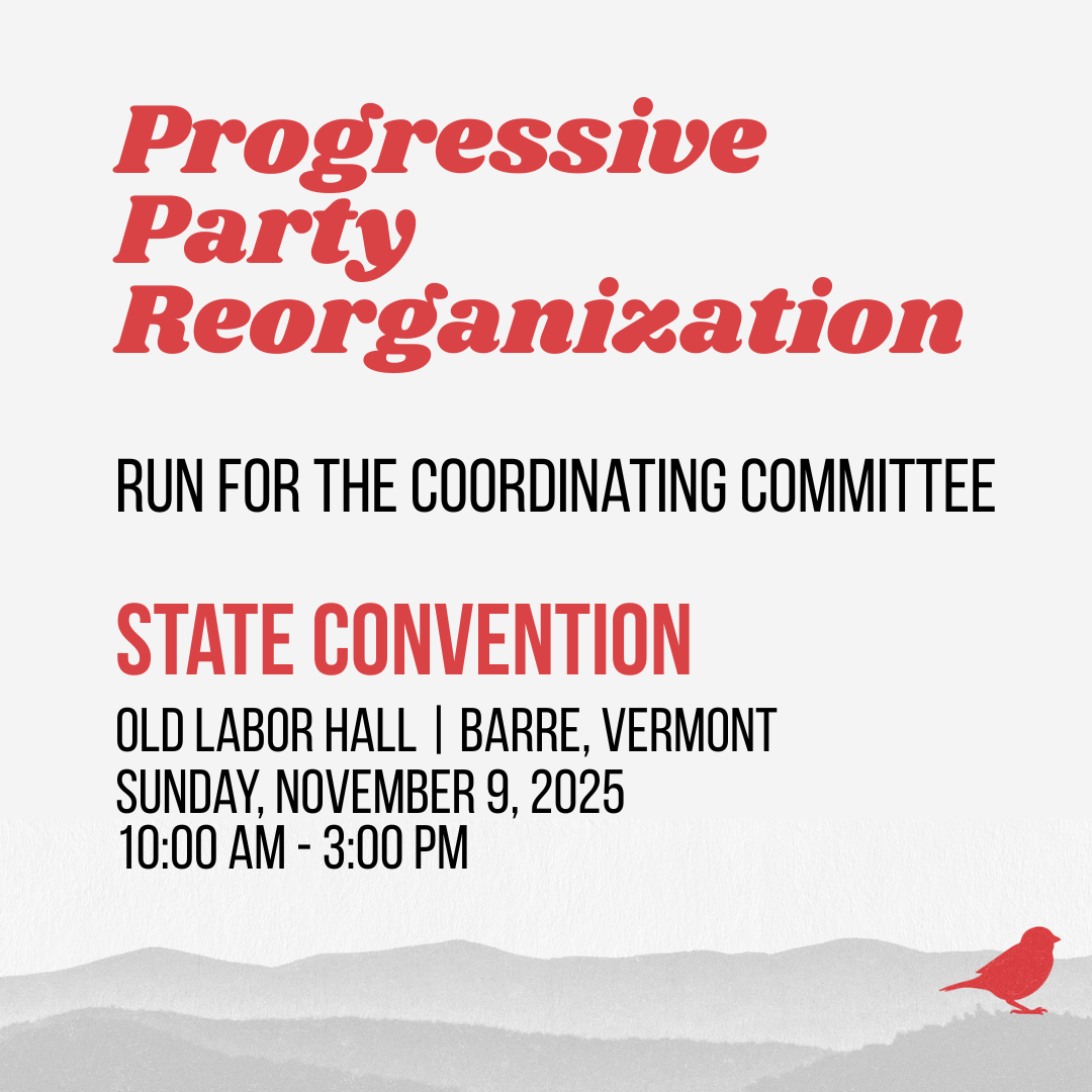 Party members will have an opportunity to vote for Coordinating Committee members at the State Convention on Sunday, November 9 at the Old Labor Hall in Barre, Vermont from 10am - 3pm.